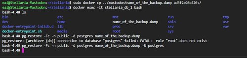@ars42525 DB_NAMEをpostgresのままにしているインスタンスのバックアップからの復元方法って、なんかコマンド一発でできたりします? https://github.com/tootsuite/mastodon/blob/master/.env.production.sample#L9